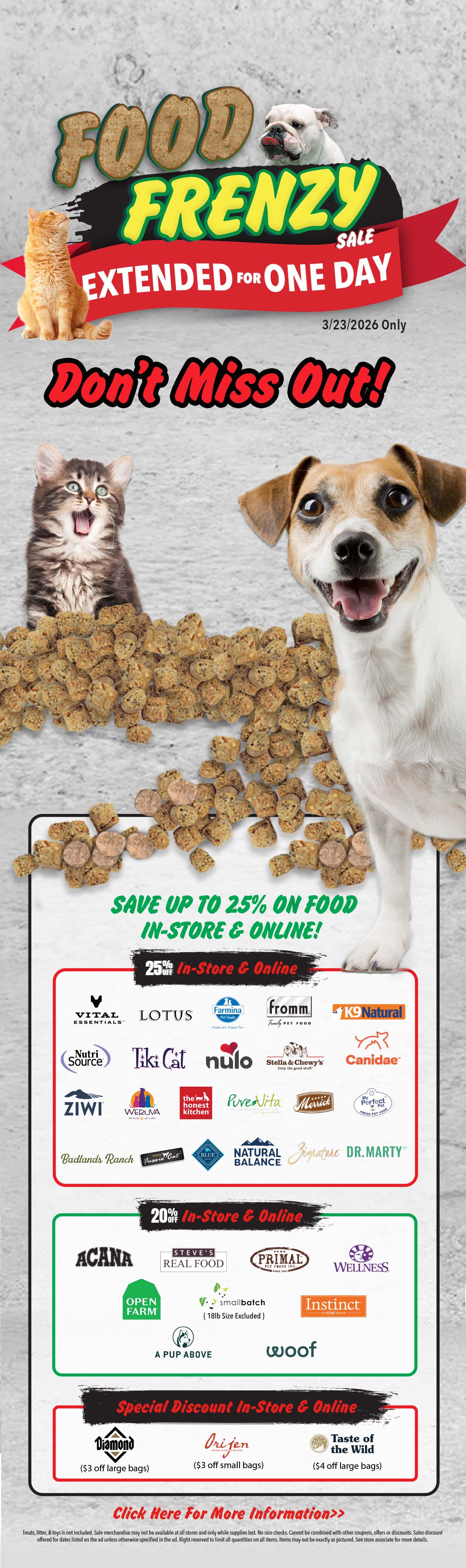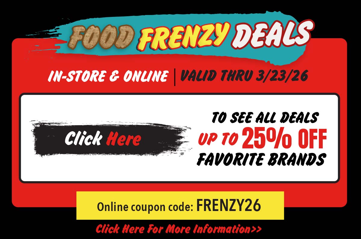 Food Frenzy In-stores and Online! In-store: No coupons necessary. Online: Must enter code at checkout. Treats, litter, & toys is not included. Sale merchandise may not be available at all stores and only while supplies last. No rain checks. Cannot be combined with other coupons, offers or discounts. Sales discount offered for dates listed on the ad unless otherwise specified in the ad. Right reserved to limit all quantities on all items. Items may not be exactly as pictured. See store associate for more details.Valid Until: 03/22/2026 | | | | |