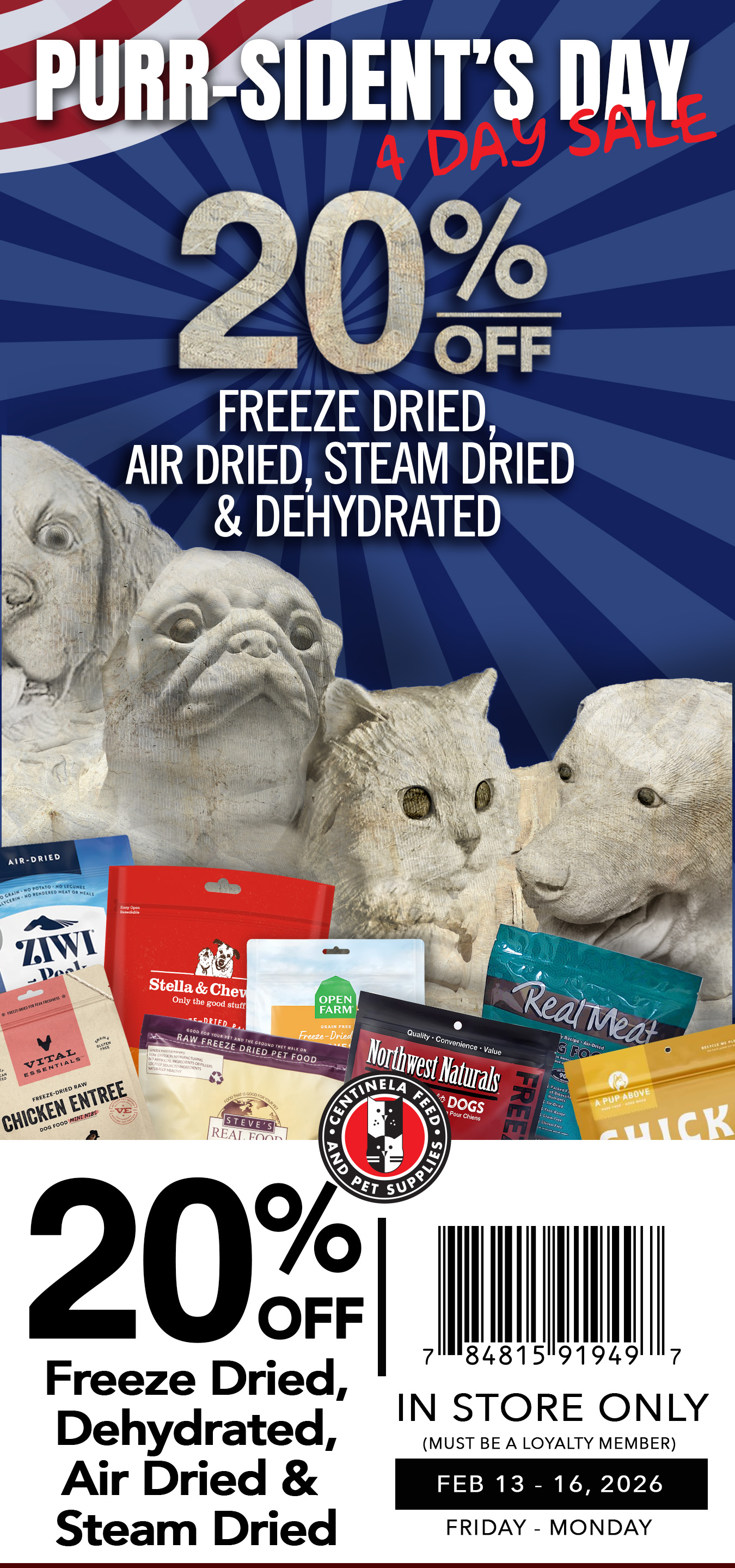 20% OFF All Freeze Dried, Air Dried, Steam Dried and Dehydrated Foods. ALTERNATIVE FEEDING. In-Store Only. In-store: Must present coupon at register. Loyalty Members Only. Not valid with any other promotion or sale. Discount taken pre sales tax. Excludes In-Store Specials, special orders, Doggie Self Wash, Small Batch Bulk Box, Primal, and bulk litter. While Supplies Last. No Rain Checks. Valid Til: 2/16/2026. | | | | |