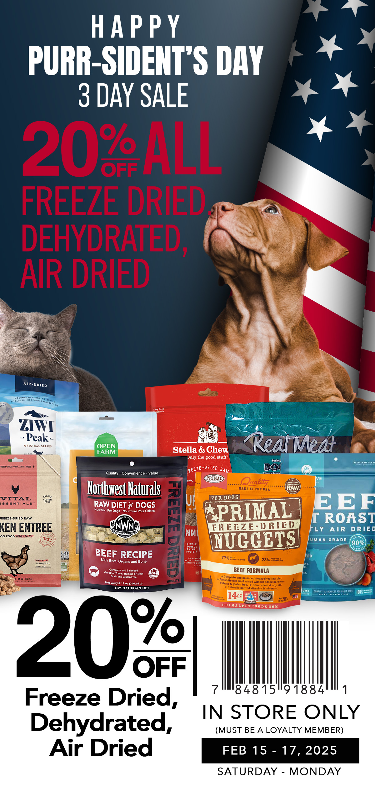 20% OFF All Freeze Dried, Air Dried and Dehydrated Foods. ALTERNATIVE FEEDING. In-Store Only. In-store: Must present coupon at register. Loyalty Members Only. Not valid with any other promotion or sale. Discount taken pre sales tax. Excludes In-Store Specials, special orders, Doggie Self Wash, Steve's Real Food, and bulk litter. While Supplies Last. No Rain Checks. Valid: 2/15/2025-2/17/2025. | | | | |