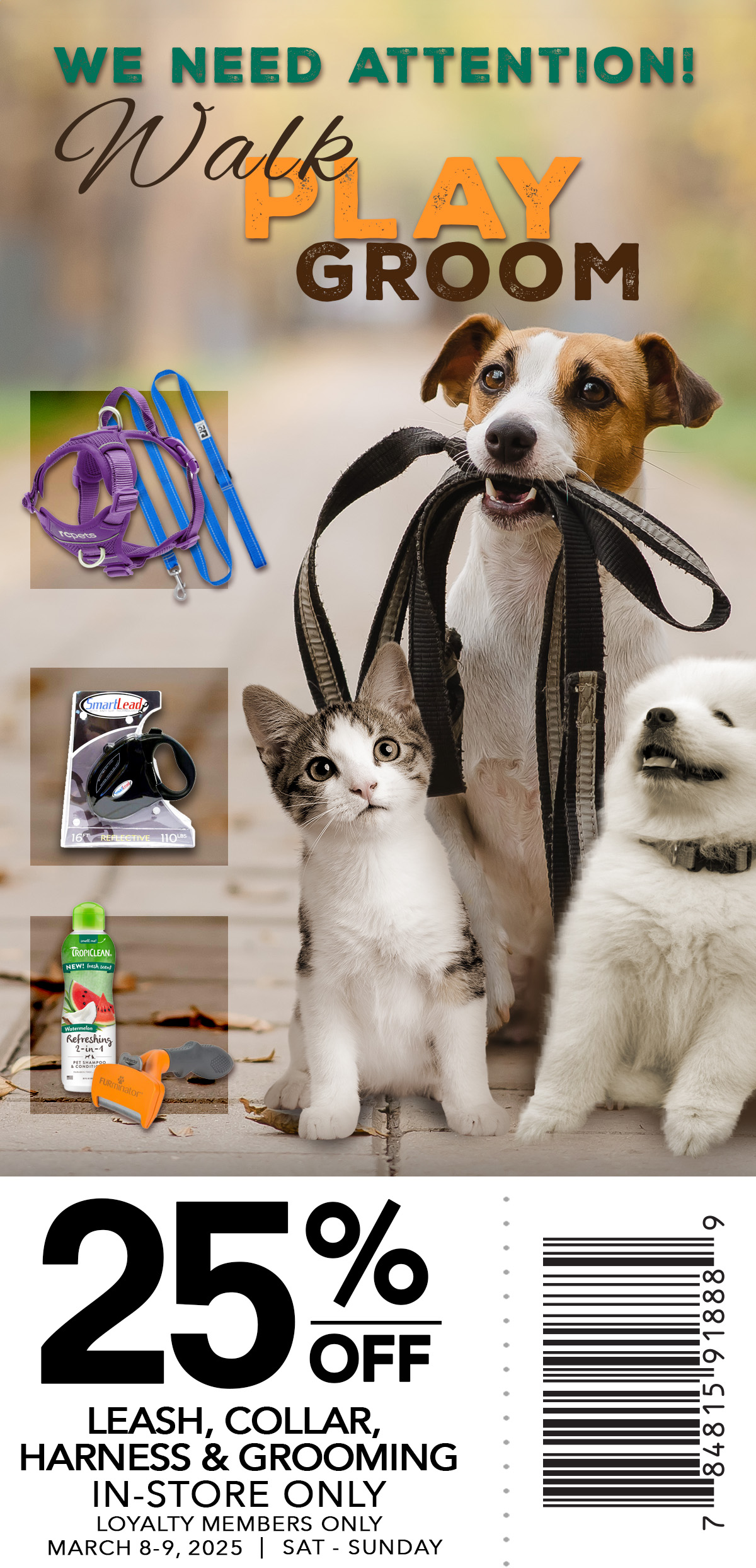 25% OFF All Leash, Collar, Harness & Grooming. In-Store Only. Must present coupon at register. Not valid with any other promotion or sale. Discount taken pre sales tax. Excludes In-Store Specials, special orders, Doggie Self Wash, and bulk litter. While Supplies Last. No Rain Checks. Valid: 3/8/2025-3/9/2025. | | | | |
