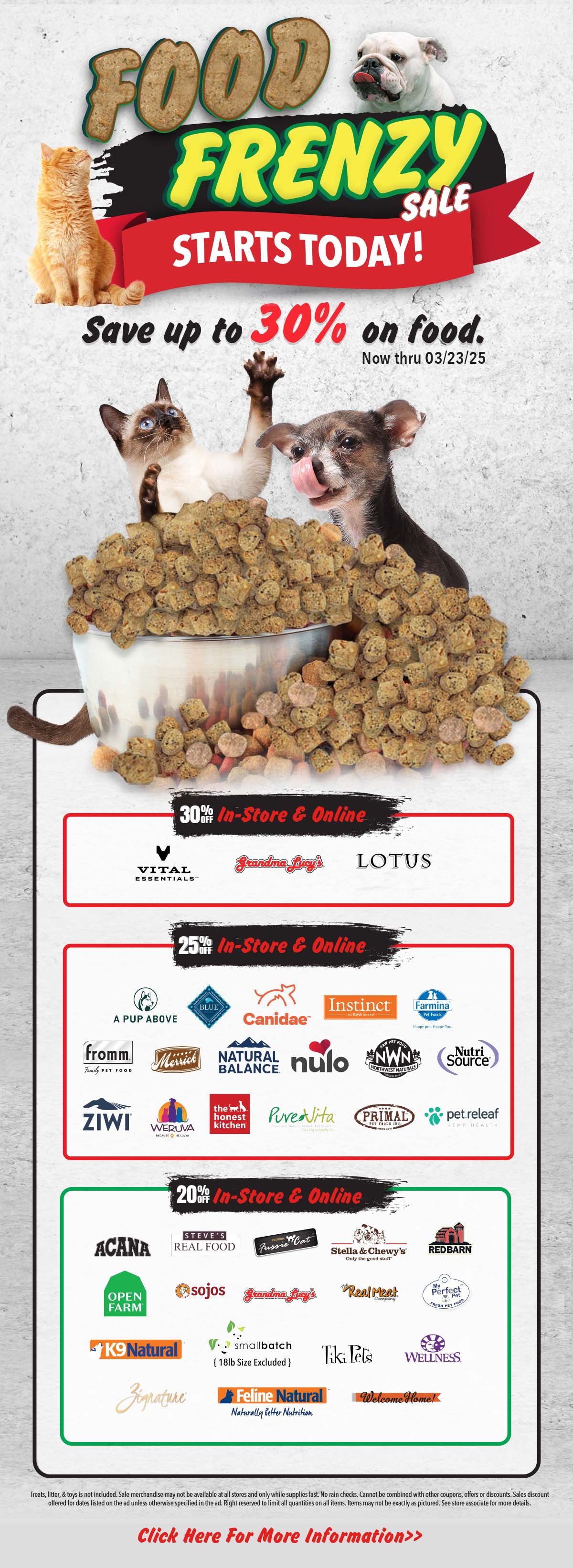 Food Frenzy In-store Happening Right. No coupons necessary. Treats, litter, & toys is not included. Sale merchandise may not be available at all stores and only while supplies last. No rain checks. Cannot be combined with other coupons, offers or discounts. Sales discount offered for dates listed on the ad unless otherwise specified in the ad. Right reserved to limit all quantities on all items. Items may not be exactly as pictured. See store associate for more details.Valid Until: 03/23/2025 | | Food Frenzy Online. Must enter coupon code at checkout. Customer must sign up/log-in to use coupon code.Treats, litter, & toys is not included. Sale merchandise may not be available at all stores and only while supplies last. No rain checks. Cannot be combined with other coupons, offers or discounts. Sales discount offered for dates listed on the ad unless otherwise specified in the ad. Right reserved to limit all quantities on all items. Items may not be exactly as pictured. See store associate for more details.Valid Until: 03/23/2025 | | | | |