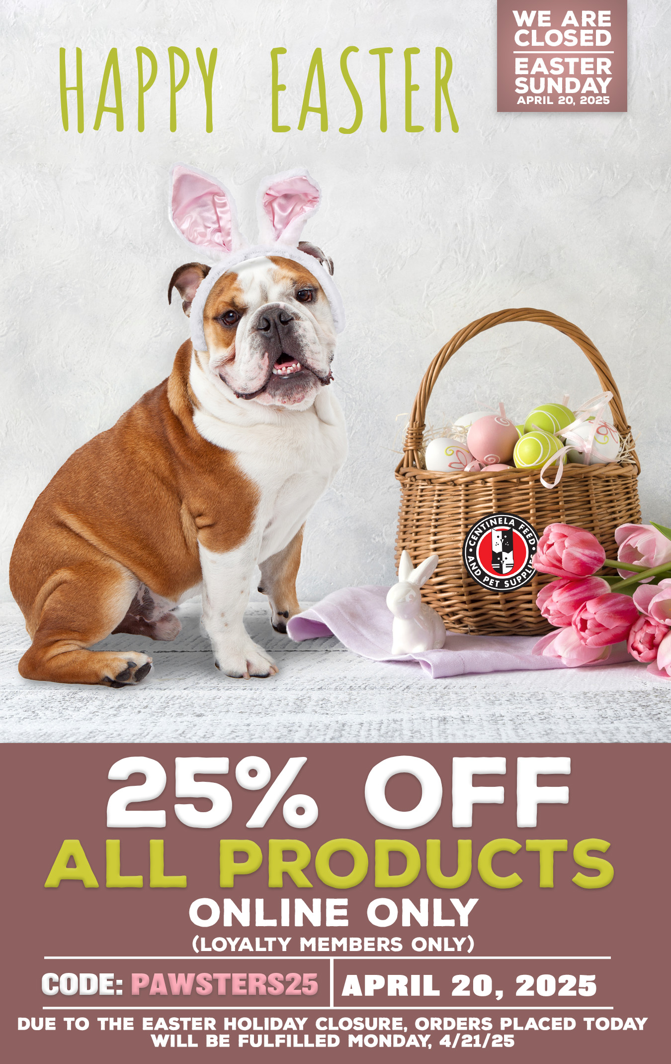 25% Off All Products. Valid Online Only. Online: Must apply coupon code for online discount. Customer must sign up/log-in to use coupon code. Not valid with any other promotion or sale. Discount taken pre sales tax. *Excludes In-Store Specials, gift cards, and bulk litter. While Supplies Last. No Rain Checks. Only 1 time use per coupon code per customer account. Offer Valid: 4/20/25. | | | | |