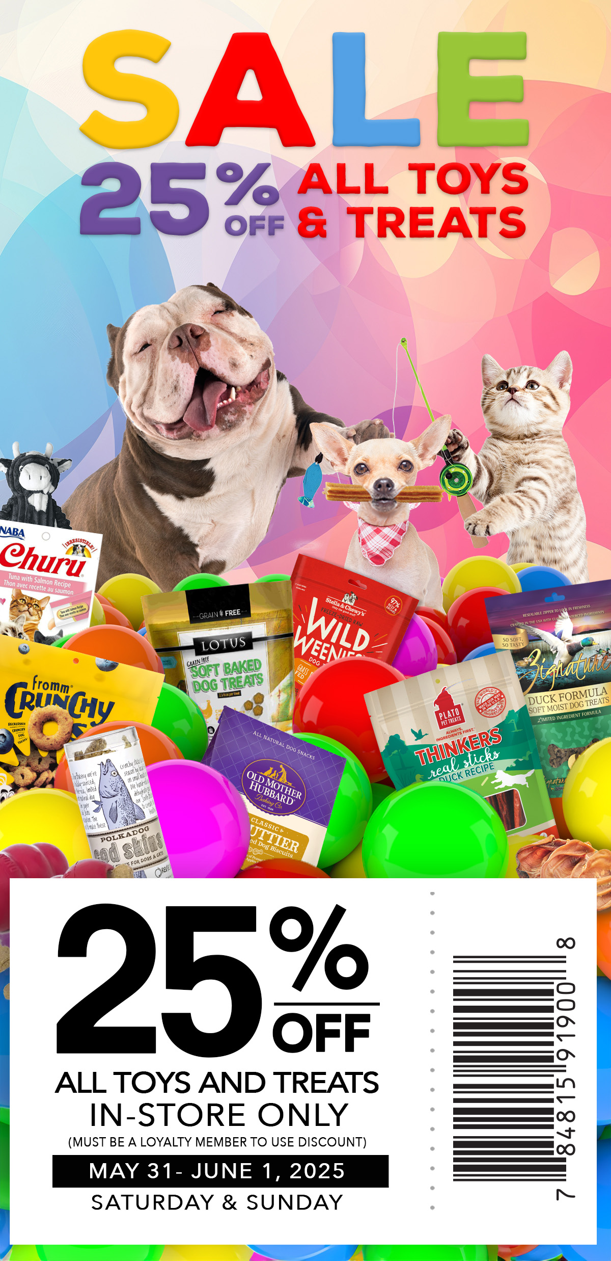 25% OFF All Toys & Treats Products! In-store Only: Must present coupon at register. Must be a loyalty member. Not valid with any other promotion or sale. Discount taken pre sales tax. Excludes In-Store Specials, Small Batch Bulk Boxes, special orders, Doggie Self Wash, and bulk litter. While Supplies Last. No Rain Checks. Valid: 5/31/2025-6/1/25 | | | | |