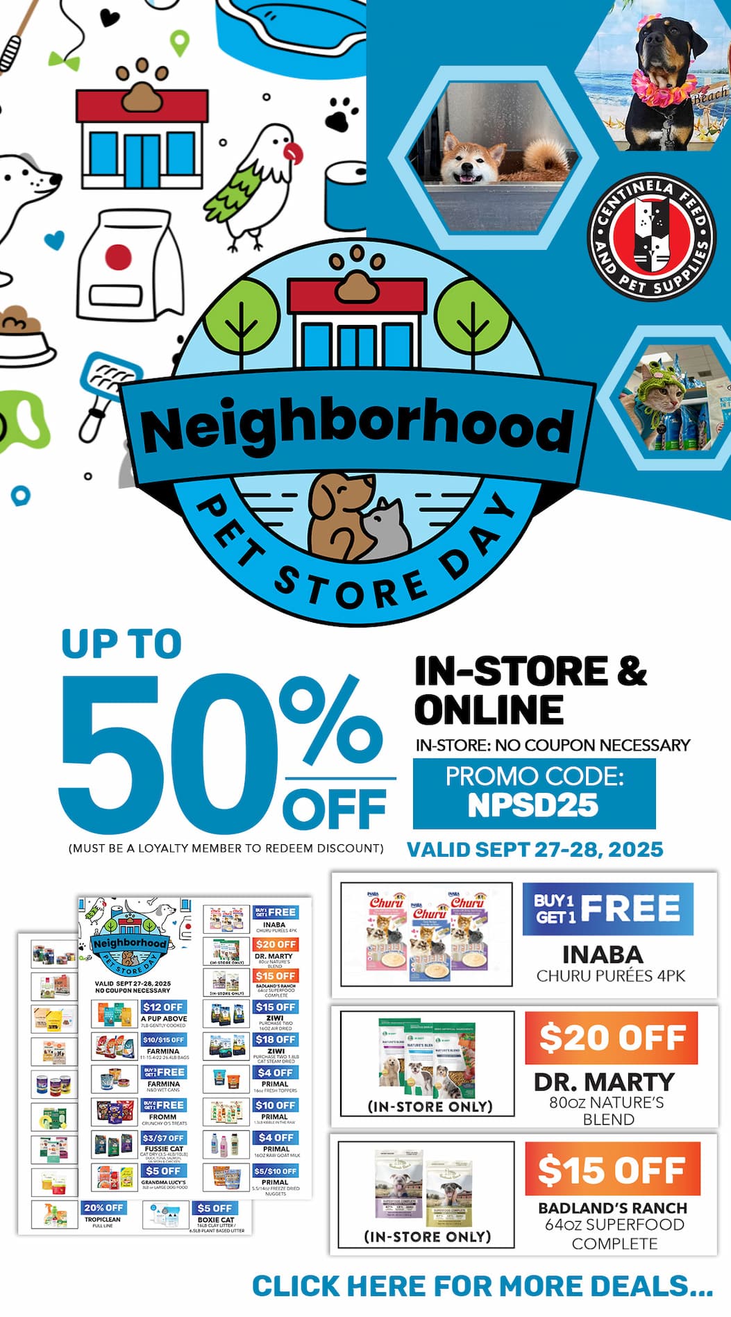 Up to 50% Off! In-Store: No coupon necessary. Online: Must enter promo code at checkout. Must be a loyalty customer. Not valid with any other promotion or sale. Discount taken pre sales tax. Excludes In-Store Specials, Gift card, Small Batch bulk boxes, and bulk litter. While Supplies Last. No Rain Checks. Valid: 9/27/2025 - 9/28/2025. | | | | |