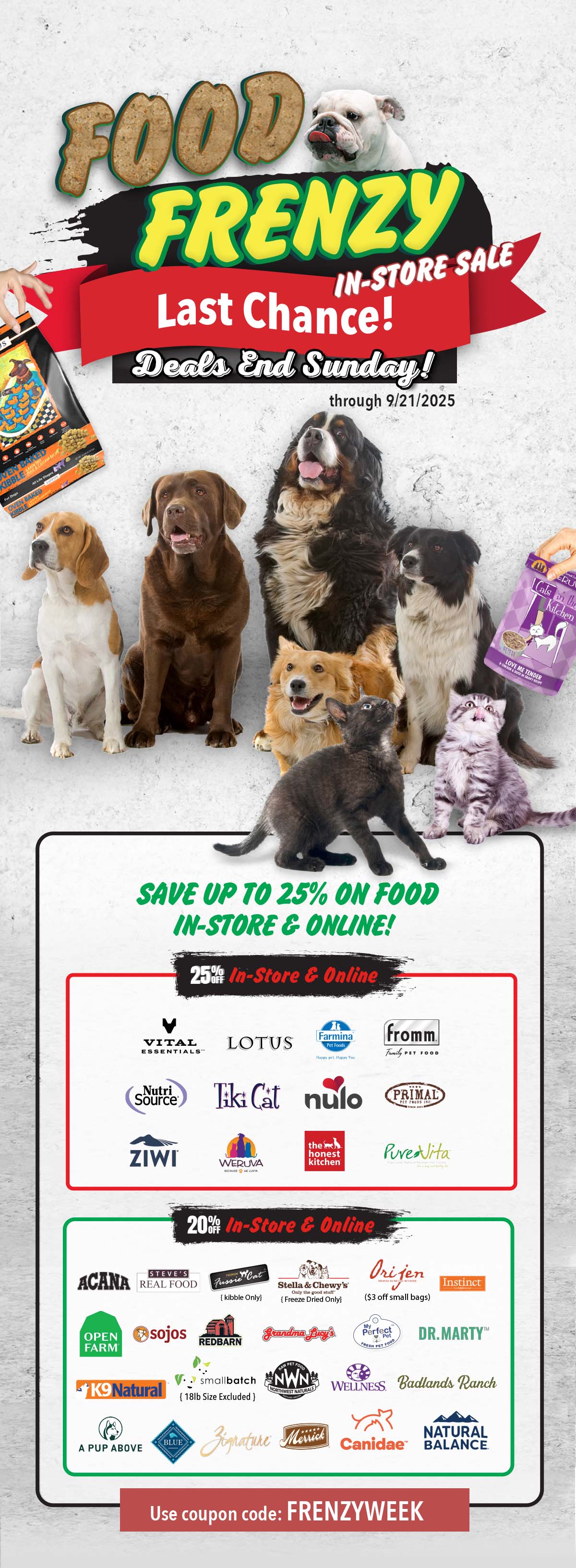Food Frenzy In-store Happening Right. In-store: No coupons necessary. Online: Must enter coupon code at checkout. Customer must sign up/log-in to use coupon code. Treats, litter, & toys is not included. Sale merchandise may not be available at all stores and only while supplies last. No rain checks. Cannot be combined with other coupons, offers or discounts. Sales discount offered for dates listed on the ad unless otherwise specified in the ad. Right reserved to limit all quantities on all items. Items may not be exactly as pictured. See store associate for more details.Valid Until: 09/21/2025 | | | | |