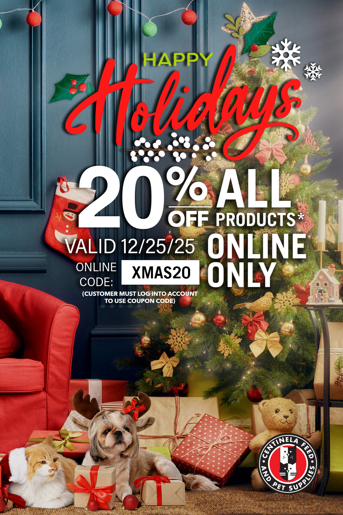 20% OFF All Products! Online Only: Must enter coupon code for discount. Must be a loyalty member. Not valid with any other promotion or sale. Discount taken pre sales tax. *Excludes In-Store Specials, special orders, Primal, and bulk litter. While Supplies Last. No Rain Checks. Valid: 12/25/2025 | | | | |