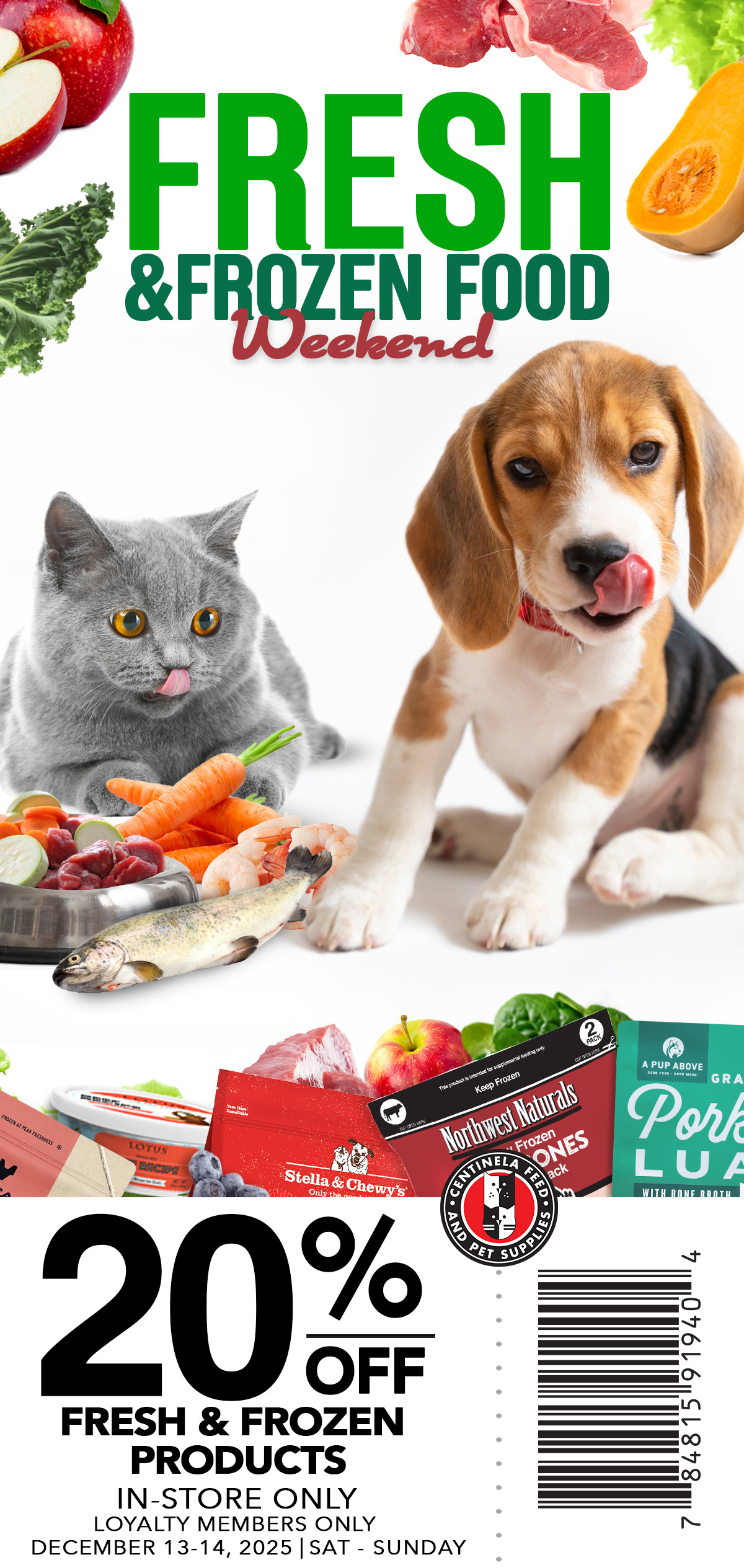 In-Store Only. Must be a loyalty member to redeem discount. Must present coupon at register. Not valid with any other promotion or sale. Discount taken pre sales tax. Excludes In-Store Specials, special orders, Small Batch bulk boxes, Primal and bulk litter. While Supplies Last. No Rain Checks. Valid: 12/13/2025 - 12/14/2025. | | | | |