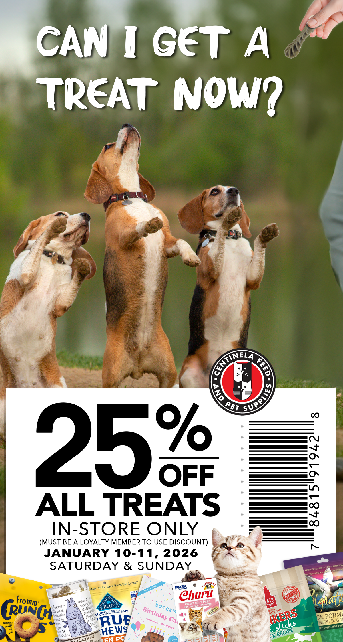25% OFF All Treats Products! In-store Only: Must present coupon at register. Must be a loyalty member. Not valid with any other promotion or sale. Discount taken pre sales tax. Excludes In-Store Specials, Primal, Small Batch Bulk Boxes, special orders, and bulk litter. While Supplies Last. No Rain Checks. Valid: 1/10/2026-1/11/26 | | | | |